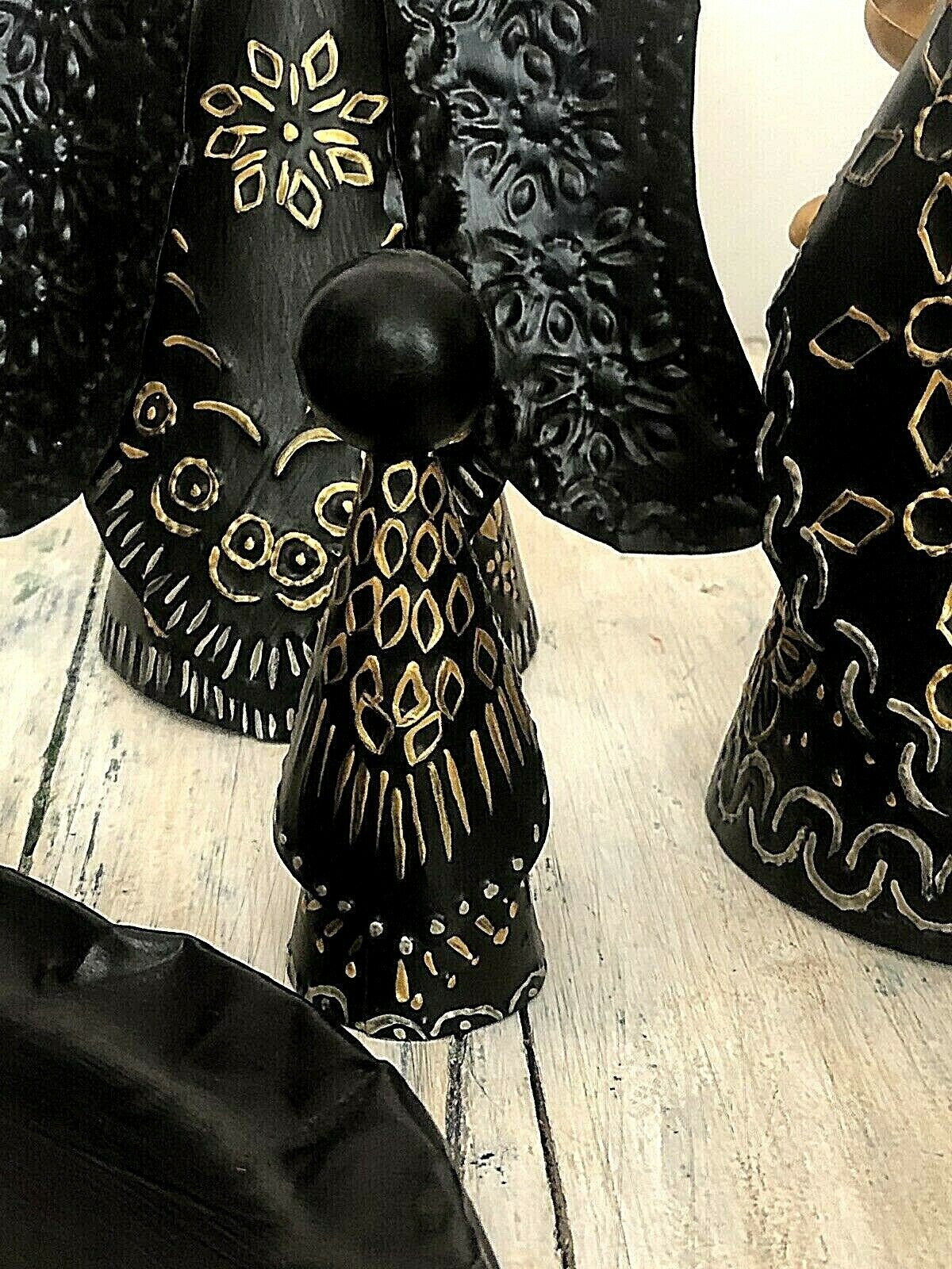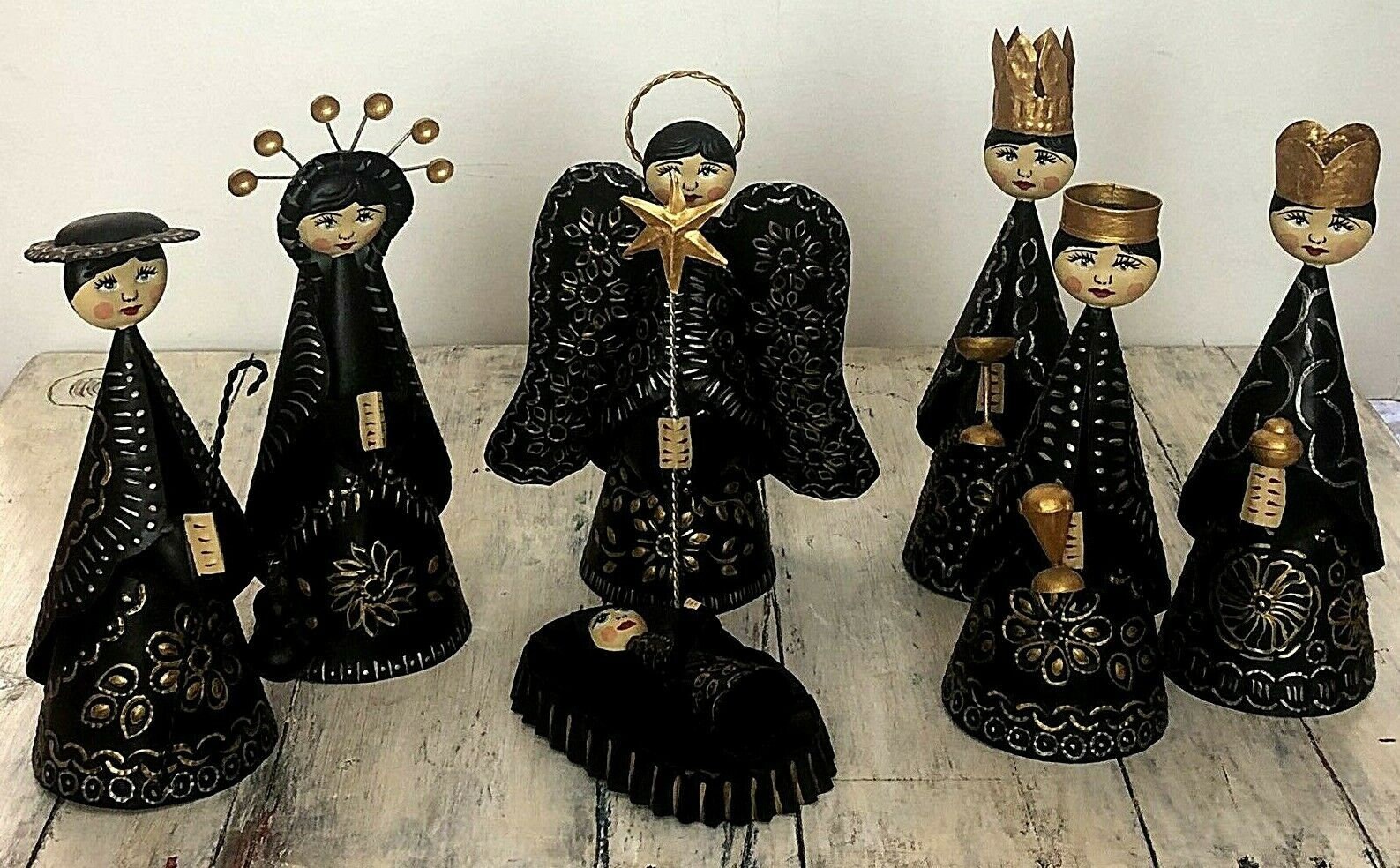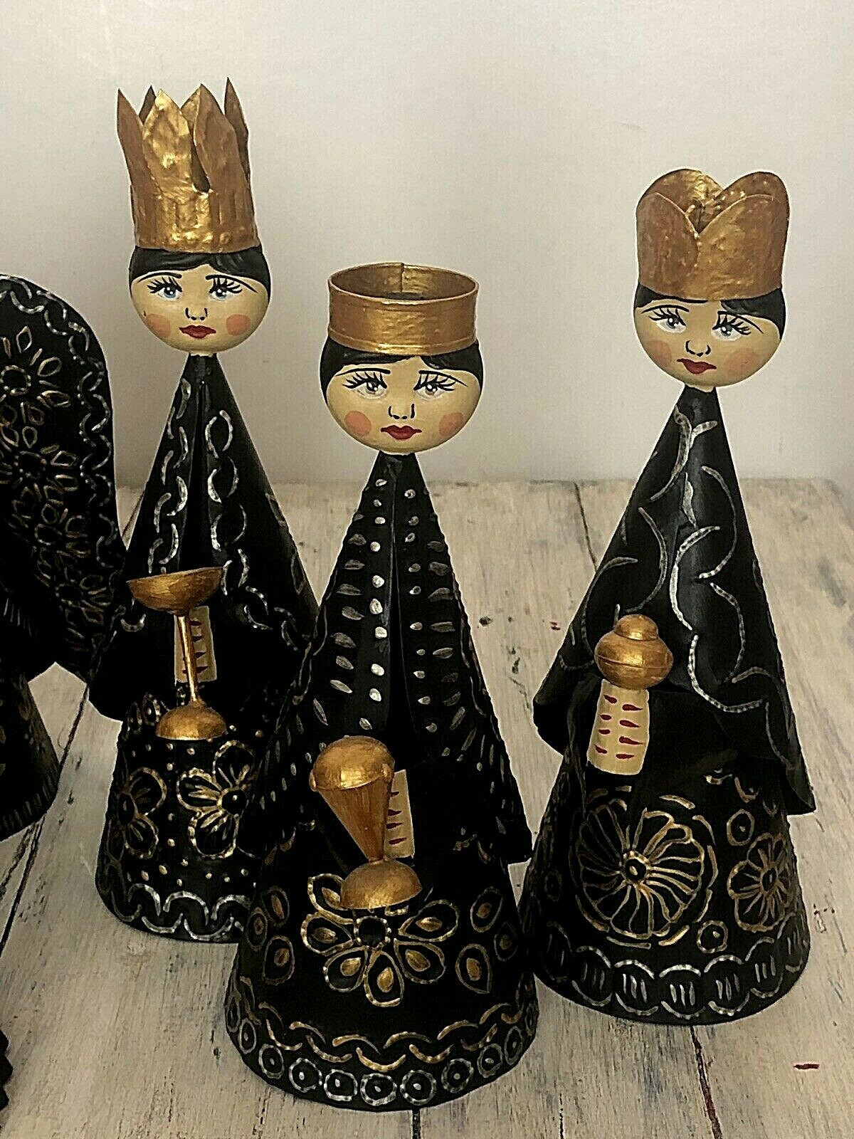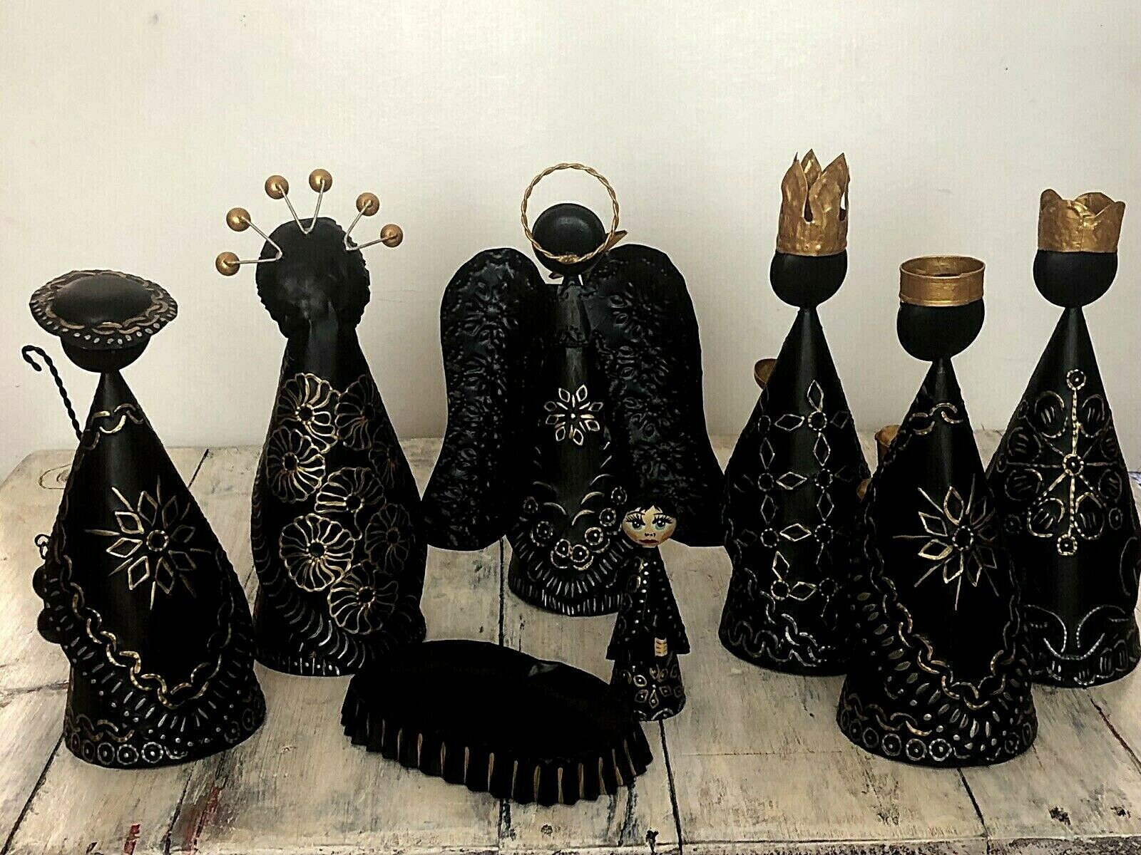 Charming large tin Nativity set - handcrafted and painted in a black and gold design.